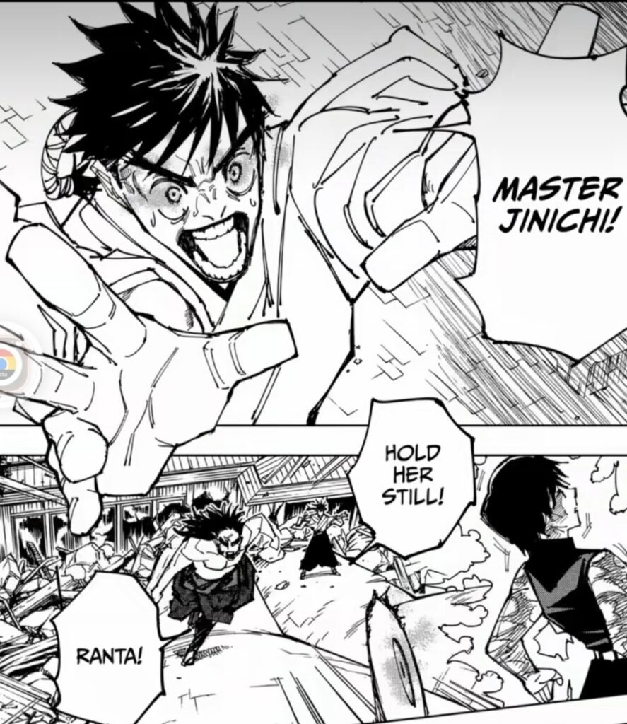 Como por ejemplo cuando Maki Zenin era detenida por “Ranta Zenin” con su técnica especial, su hermano “Máster Jinichi” camina como despreocupado y despacio, apesar de que su hermano está sufriendo por mantener a Maki quieta.