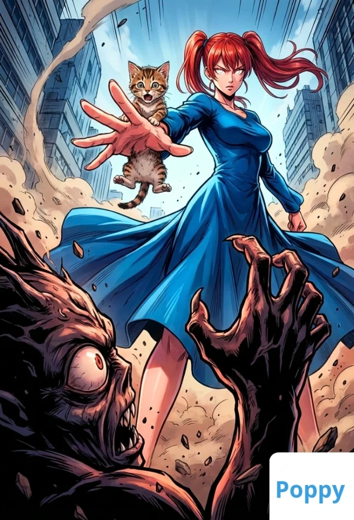 Al ser un cambio tan drástico de juguete al anime de One punch, Poppy se transforma en una chica de carne y huesos real que combate el mal.