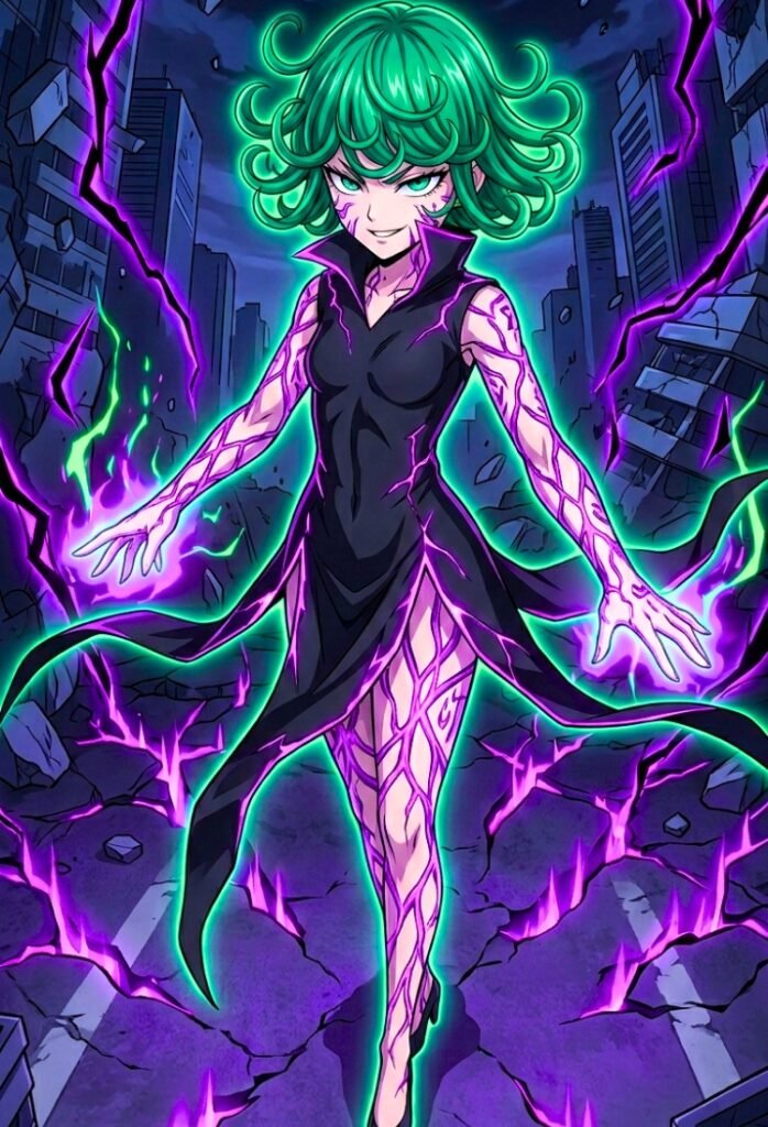 Cambiamos su apariencia por una más temible, en donde vemos a Tatsumaki con su traje de heroína caracteristico en One punch Man, pero con iluminaciones en los bordes de color morado(similar al color y brechas que traían los demonios en la película).