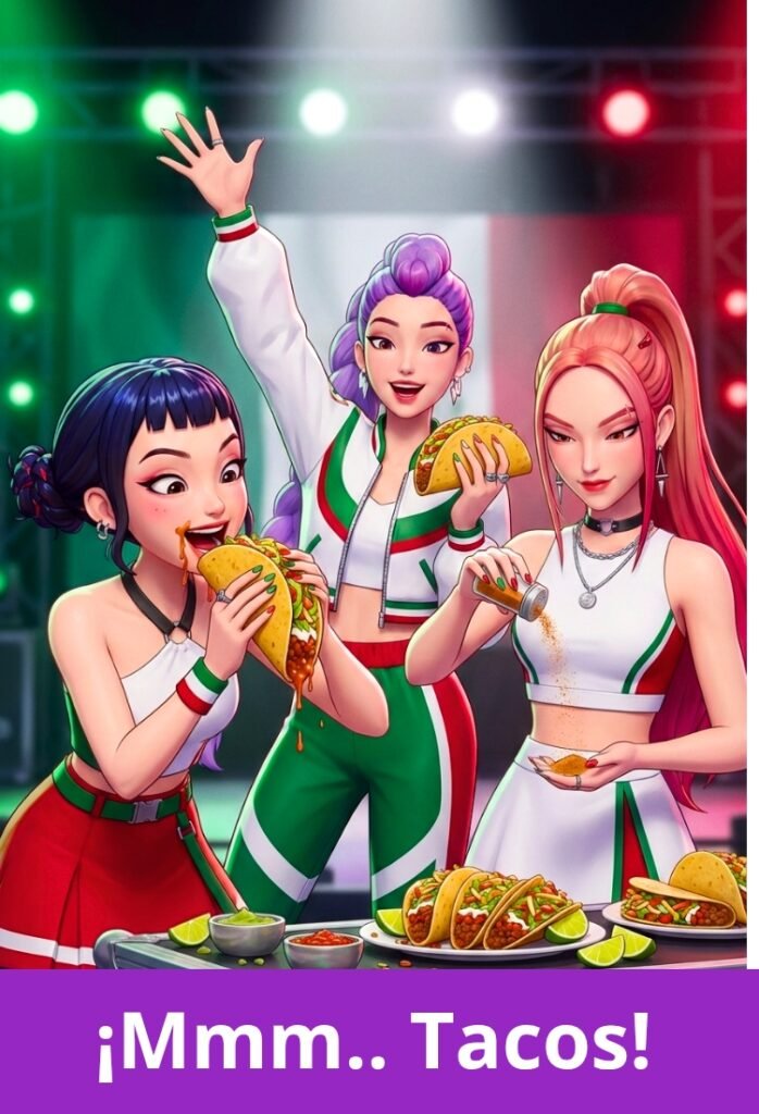 Una de las cosas que más aman los mexicanos es ver a extranjeros disfrutar de nuestra gastronomía, este fanart lleva a las guerreras K-pop a comer tacos en México.