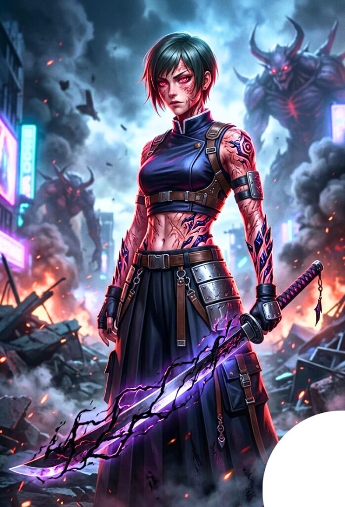 Rasgos Distintivos: Su larga trenza púrpura se mantiene impecable a pesar del combate, y su mirada refleja una confianza absoluta mientras domina la escena.