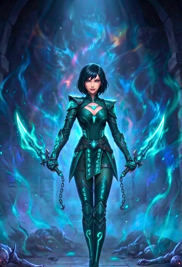 Armas de Asesina: Empuña un par de dagas cortas con hojas de energía púrpura pura. Las armas parecen estar conectadas a su propia esencia, emitiendo un aura de velocidad y precisión.
