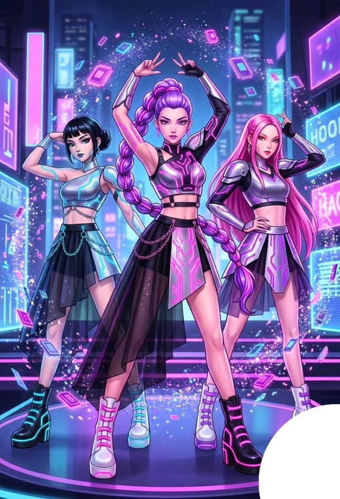 Las guerreras K-pop adoptan el estilo futurista Cyberpunk con trajes robóticos y estética neon implementada para mejorar su presencia en los escenarios.